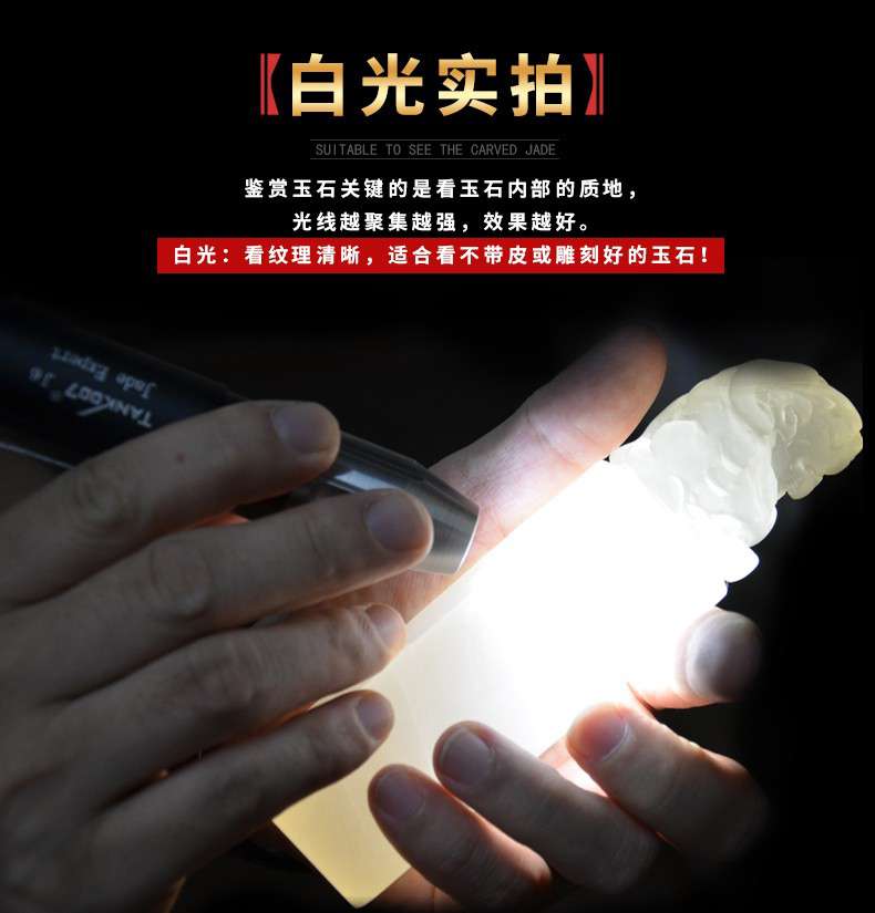 照玉手電筒可用于照玉石、翡翠檢驗、玉鐲鑒定、琥珀鑒定、原石檢測、賭石等多種場合。